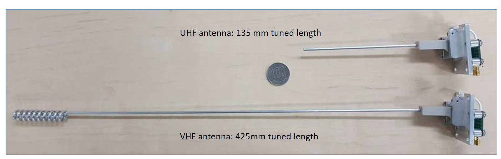 The VHF antenna weighs 8.13g and measures 425mm. It has an induction coil 50mm in length and 12mm in outer diameter, and is used to reduce the antenna’s physical length and be accommodated in the satellite. The UHF antenna weighs 1.6g and measures 135mm. Each antenna rod is made up of Al 6061 material with a diameter of 2.4 mm. It is coated with chromium anodic finish to regulate the temperature fluctuations of the rod in orbit, while the termination is coated with a gold plated finish to facilitate soldering. Figure 4 shows the prototype of the VHF and UHF antennas.