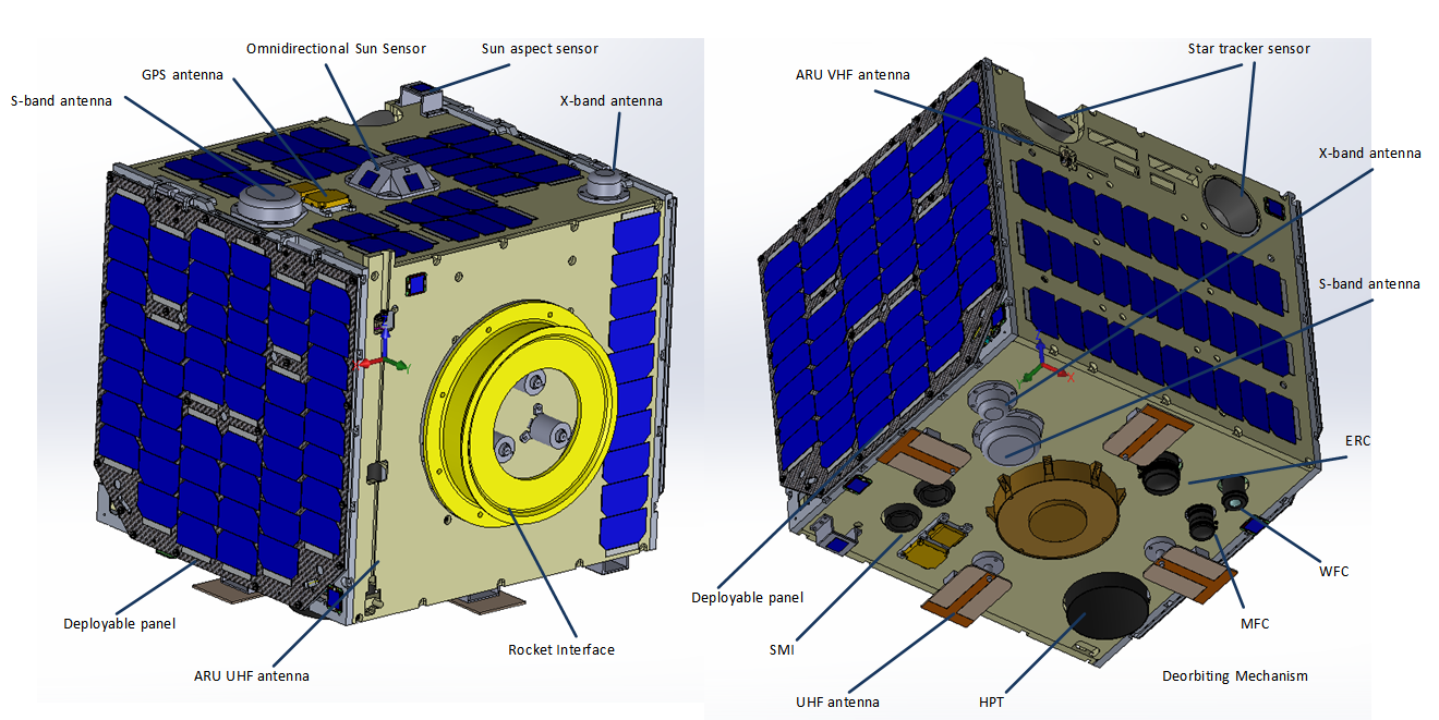 This subsystem is responsible for sending and receiving data to and from the ground station. Diwata-2 carries a UHF-band receiver (URX), a S-band receiver (SRX), a S-band transmitter (STX) and a X-band transmitter (XTX). URX and SRX are used for receiving commands from the ground station. The SRX is used for transmitting housekeeping data and as a backup link for sending images to ground. The XRX is dedicated for sending images. Below shows the location of the antennas for these communication modules, along with the GPS and ARU antennas.